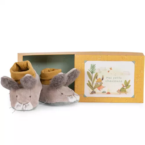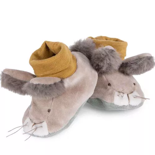 Een paar lieflijke babyslofjes ‘Rabbit Baby Slippers’ uit de ‘Trois Petits Lapins’ serie van het Franse merk Moulin Roty die de babyvoetjes warm houden.Â
