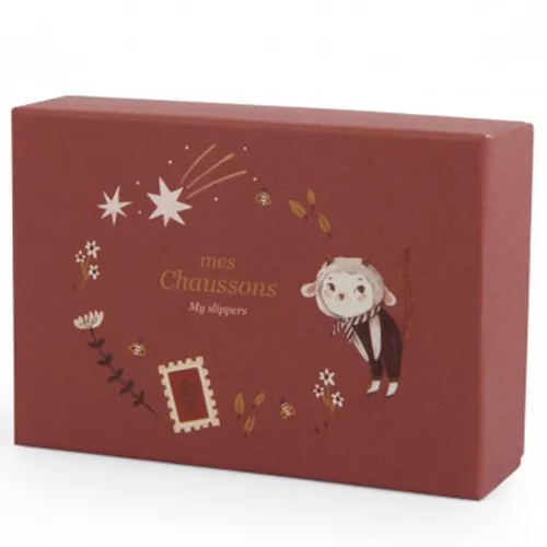 Een paar lieflijke babyslofjes ‘Nuage the sheep slippers’ uit de ‘Après la pluie’ serie van het Franse merk Moulin Roty die de babyvoetjes warm houden.
