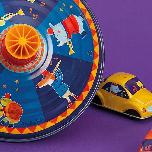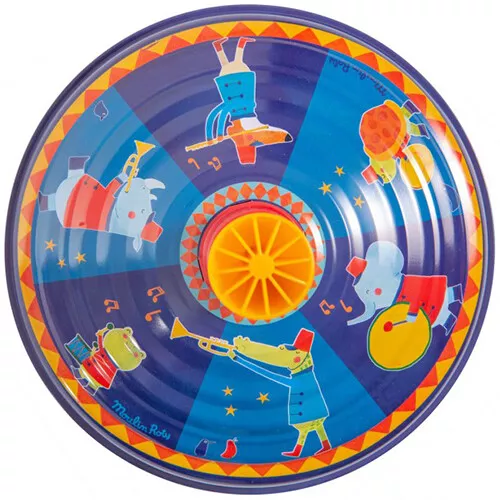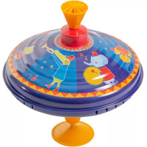 Een grote, metalen bromtol ‘Large Fanfare Spinning Top – Les Jouets’ van het Franse merk Moulin Roty met kleurrijke dieren van de fanfare.Â