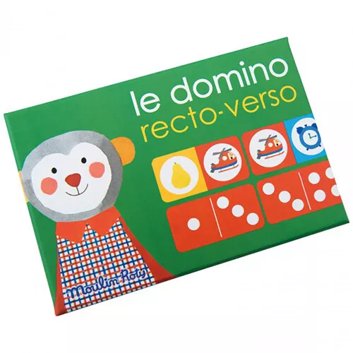 Twee spellen in één met dit dominospel voor kinderen ‘Double-sided Dominoes – Les Popipop’ van het Franse merk Moulin Roty. Met de dubbelzijdige speelkaarten zijn twee varianten domino te spelen.