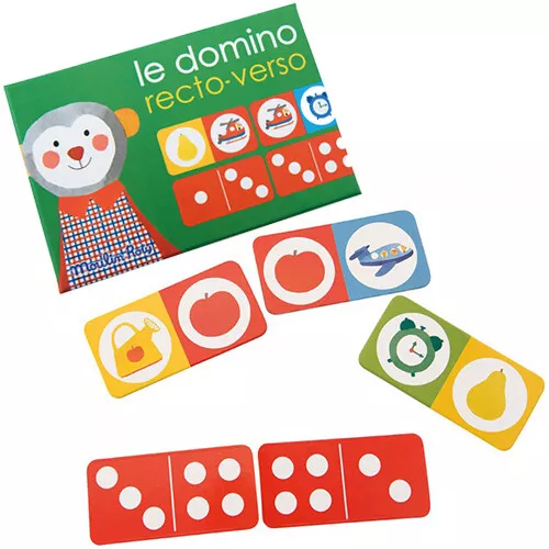 Aan de ene zijde staan verschillende aantallen stippen, zoals in het klassieke dominospel, om getallen aan elkaar te leggen. Aan de andere kant staan illustraties in sprekende kleuren om bij elkaar te zoeken.