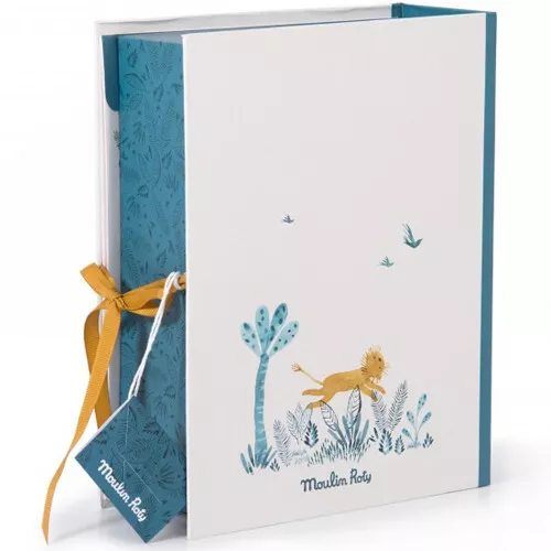 In deze geboortedoos met de safaridieren van ‘Sous mon baobab’ van het Franse merk Moulin Roty kunnen herinneringen en babyschatten verzameld worden.