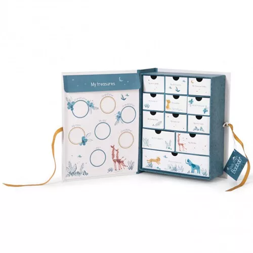 De babyherinneringsdoos heeft een geboorteboom voor familiefoto’s en twaalf laatjes om babyspulletjes zoals het geboortearmbandje, de eerste fopspeen, het geboortekaartje en de eerste schoentjes in te bewaren.