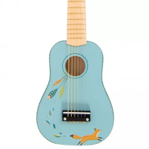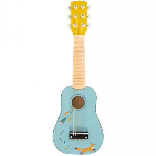 Een houten kindergitaar met Chaussette de vos uit de ‘Le voyage d’Olga’-serie van het Franse merk Moulin Roty.
