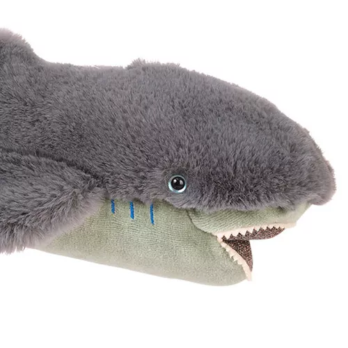 De grijze haaienknuffel heeft glittervinnen en een fluweelzachte buik. Zijn ogen zijn helderblauw en hij laat zijn perfecte gebit graag zien.