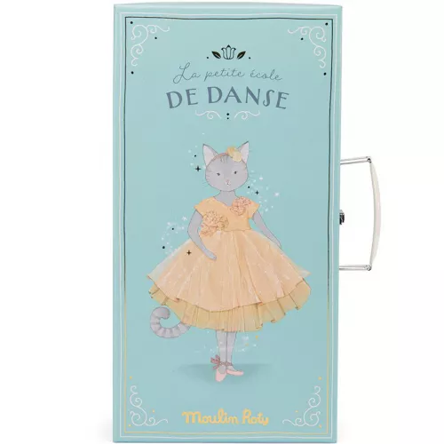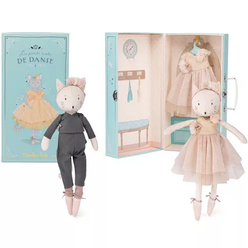 Met deze poppenkoffer ‘Valise la Penderie de Célestine’ laat de knuffelpoes uit de collectie ‘La petite école de danse’ van het Franse merk Moulin Roty haar kledingkast zien.