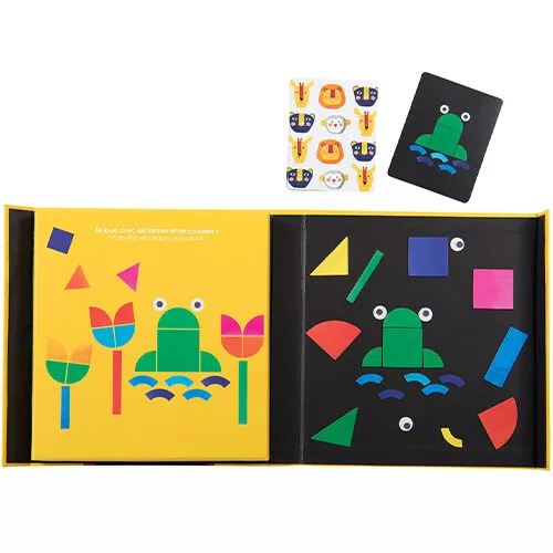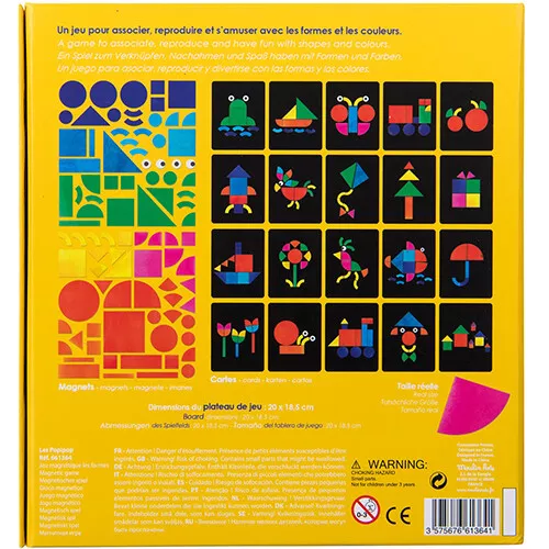 Leer de verschillende vormen combineren en maak kleurrijke creaties met dit fantasierijke magneetboek uit de ‘Les Popipop’ serie van het Franse merk Moulin Roty. Gebruik de speelgoedmagneten om de afbeeldingen van de 20 dubbelzijdige voorbeeldkaarten na te bootsen aan de binnenzijde van de doos. Of laat de fantasie de vrije loop om nieuwe figuren te ontdekken en te puzzelen.