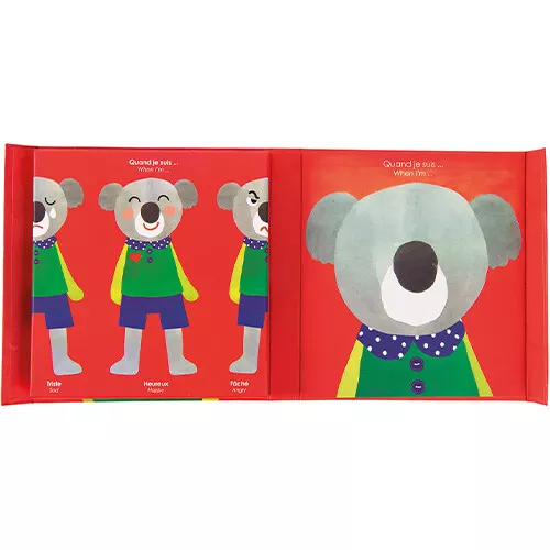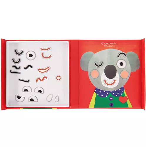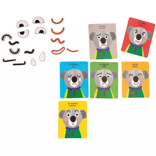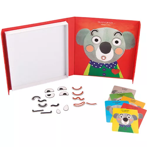 Het magneetspel bevat zes kaarten, waarop de koala verschillende emoties uitbeeldt. Kinderen kunnen met de 25 magneten de overeenstemmende gezichtsuitdrukking op het speelbord plaatsen.