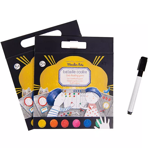 Het klassieke denkspelletje mastermind in een nieuw, compact jasje, voor onderweg of op vakantie. In het magneetspel uit de ‘Aujourd’hui C’est Mercredi’ serie van het Franse merk Moulin Roty is het van belang om logisch na te denken. Het doel van het spel is om binnen negen pogingen de kleurencode van de tegenstander te kraken.