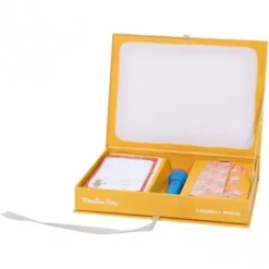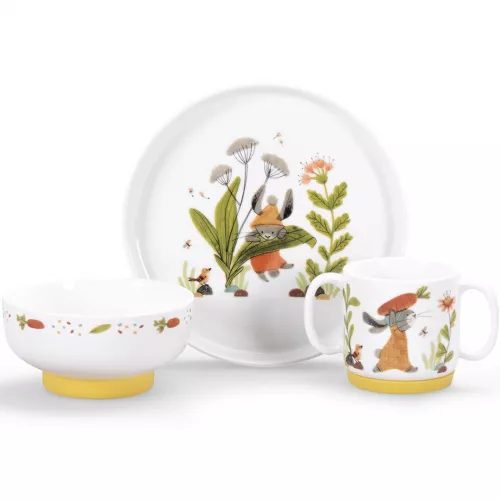 De vriendelijke diertjes op de kinderserviesset ‘Trois Petits Lapins’ van het Franse merk Moulin Roty maken samen tafelen net wat feestelijker. Met een kom, bord en een mok.