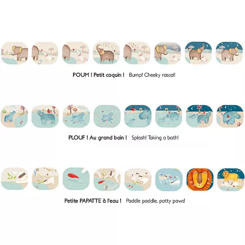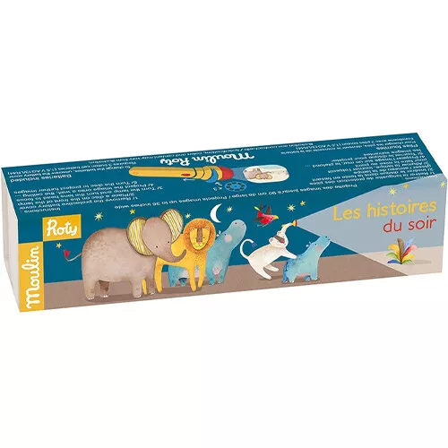 Een magische verhaaltjeslamp ‘Story Book Torch – Les Papoum’ van het Franse merk Moulin Roty met drie kleine verhaaltjes in zachte kleuren van de lieflijke papoumfiguurtjes.