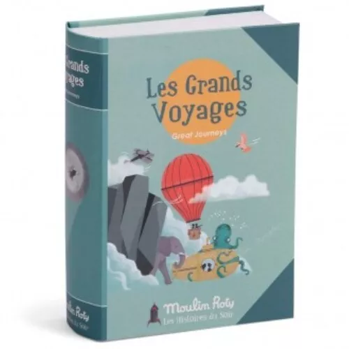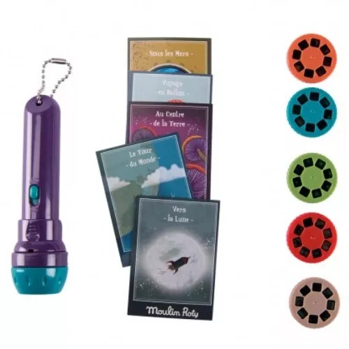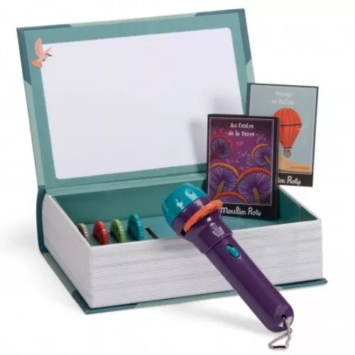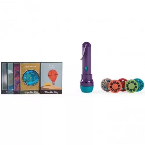 Een magische verhaaltjeslamp ‘Story Book Torch Set – Travels’ van het Franse merk Moulin Roty met vijf verschillende reisverhalen en een handige opbergdoos.