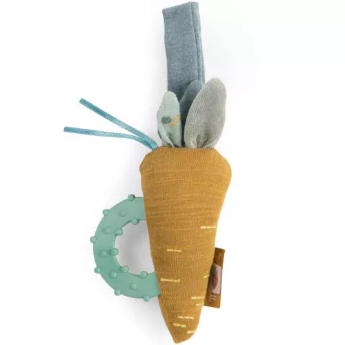 Voor de baby een grappige, stoffen rammelaar met bijtring ‘Carrot Teething Rattle’ uit de collectie ‘Trois Petits Lapins’ van het Franse merk Moulin Roty.