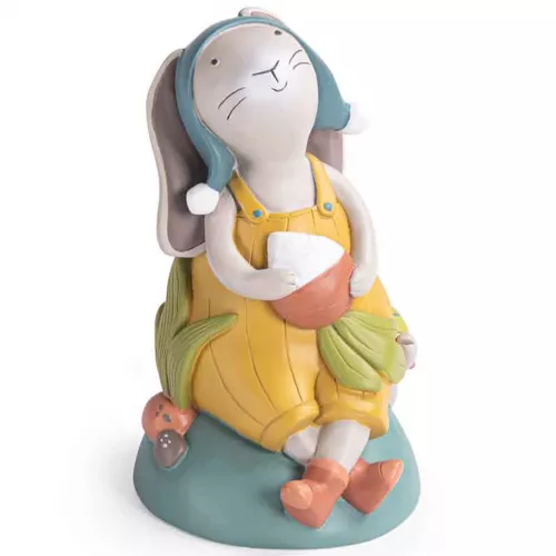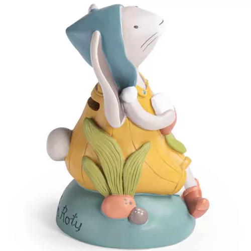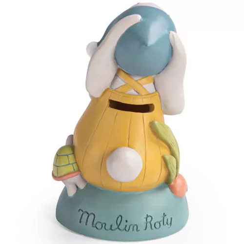 Een konijnenspaarpot uit de serie ‘Trois Petits Lapins’ van het Franse merk Moulin Roty. Het vriendelijke konijntje houdt een knapperig radijsje vast. Ondertussen waakt hij ook over de gespaarde centjes.