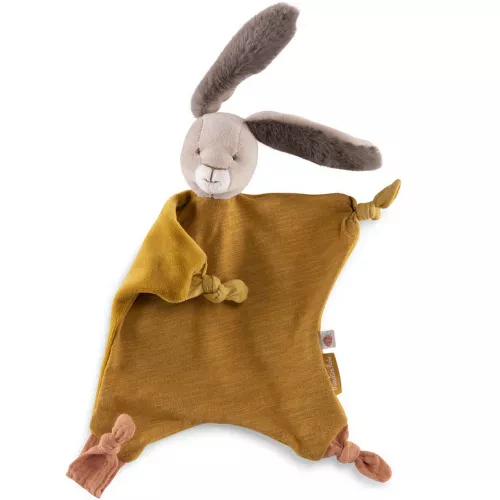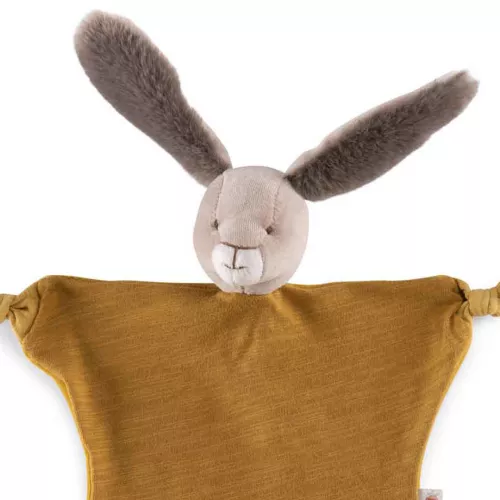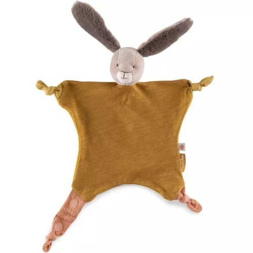 Een knuffeldoek ‘Ochre’ uit de serie ‘Trois Petit Lapins’ van het Franse merk Moulin Roty om mee te tutten en te frutten. Het babydoekje met konijnenknuffeltje voelt prettig aan en geeft houvast. Aan het lieflijke konijnendoekje kan een speen worden bevestigd waardoor het ook fungeert als speendoek.