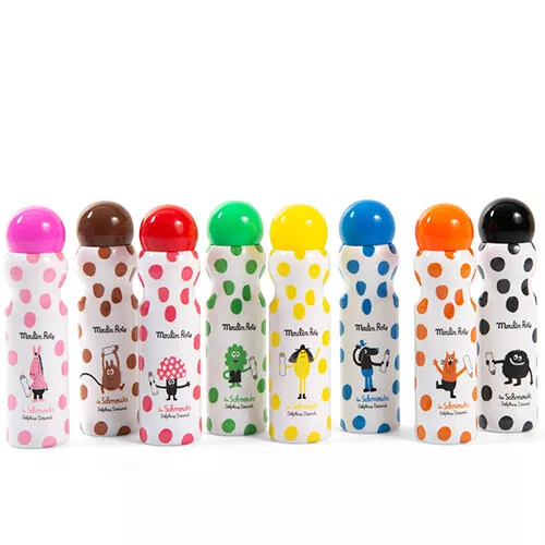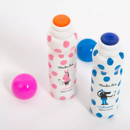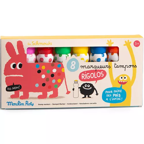 Het is een feest om met deze stiften te kleuren en te stempelen. Met deze acht stempelmarkers ‘Les Schmouks’ van het Franse merk Moulin Roty zijn tekeningen in een handomdraai te versieren met gekleurde stippen.Â