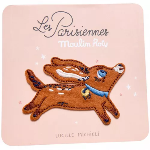 Een geborduurde strijkpatch ‘Brodé Chien’ uit de ‘Les Parisiennes’ collectie van het Franse merk Moulin Roty. Het opstrijkbare embleem met een speelse hond vrolijkt t-shirts, spijkerjasjes of rugzakjes op.