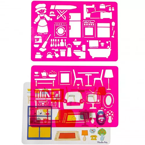 Tekenen wordt reuze makkelijk met dit knutselpakket ‘Set de pochoirs à dessin – Dans la maison’ van het Franse merk Moulin Roty! Met de sjabloonkaarten van verschillende objecten in huis kunnen kinderen mooie en creatieve tekeningen maken. Leg het sjabloon op een vel papier, volg de lijntjes in het sjabloon met een stift of potlood en kleur de tekening in!