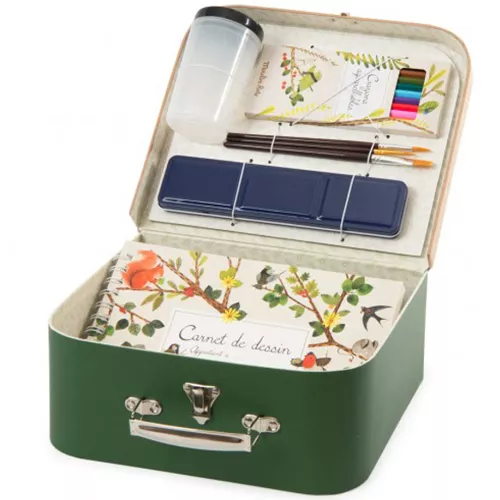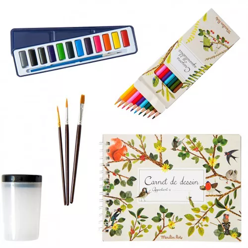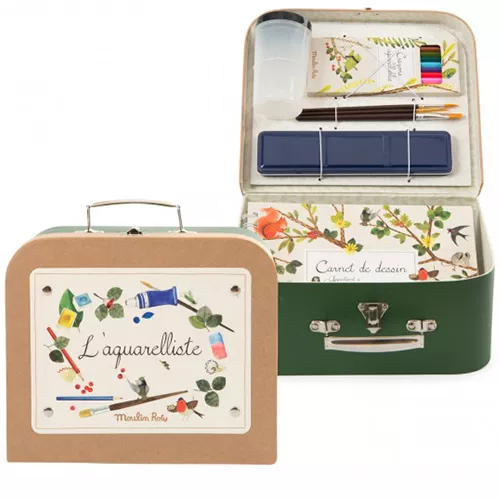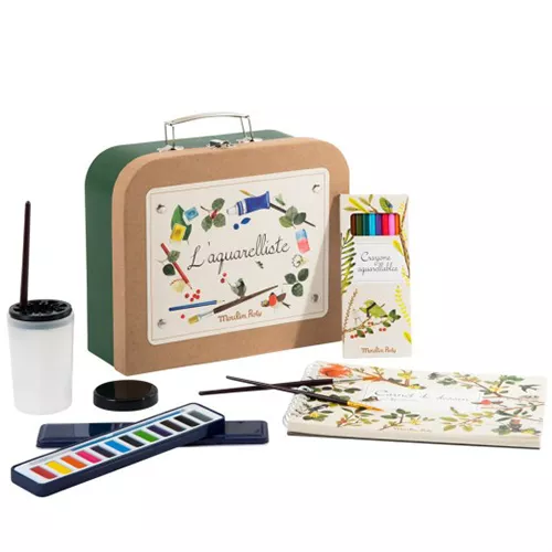 In het koffertje ‘Watercolour Artist Case – Le Jardin Du Moulin’ van het Franse merk Moulin Roty zit alles wat kleine artiesten nodig hebben om waterverf kunstwerken te maken.