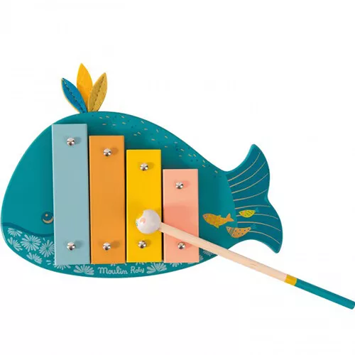 Een vrolijke xylofoon met prachtige illustraties uit de serie ‘Le voyage d’Olga’ van het Franse merk Moulin Roty. Het speelgoedinstrument in de vorm van een walvis is gemaakt van hout en heeft 4 tonen.